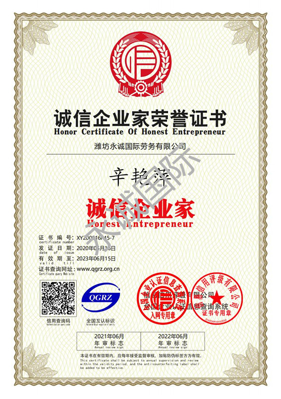 国家商务部颁发的《中华人民共和国对外劳务合作(外派劳务)经营资格证书》,编号:LW370020160002。